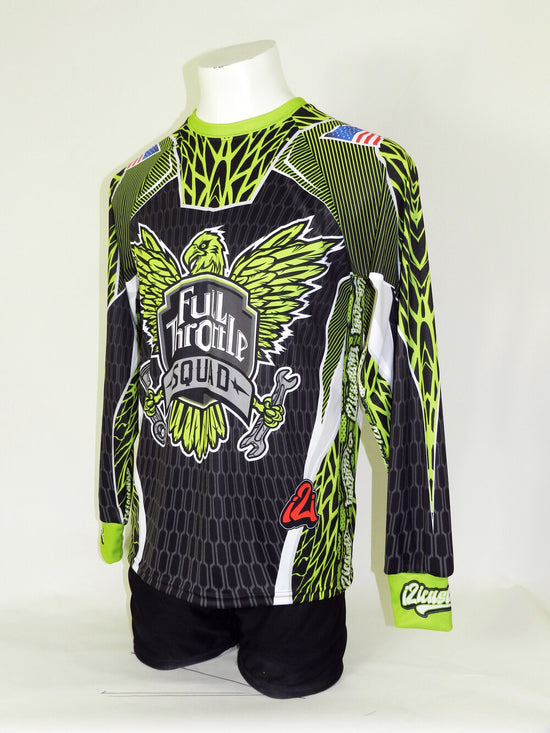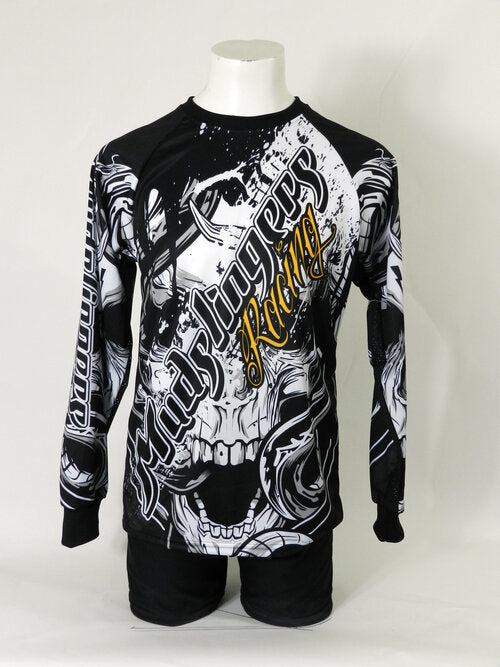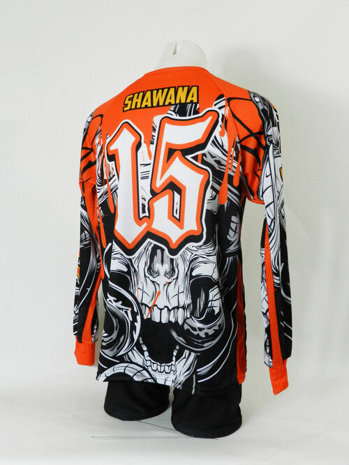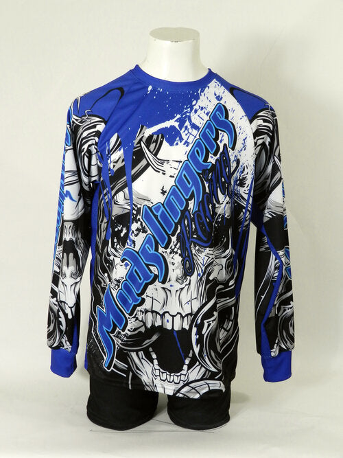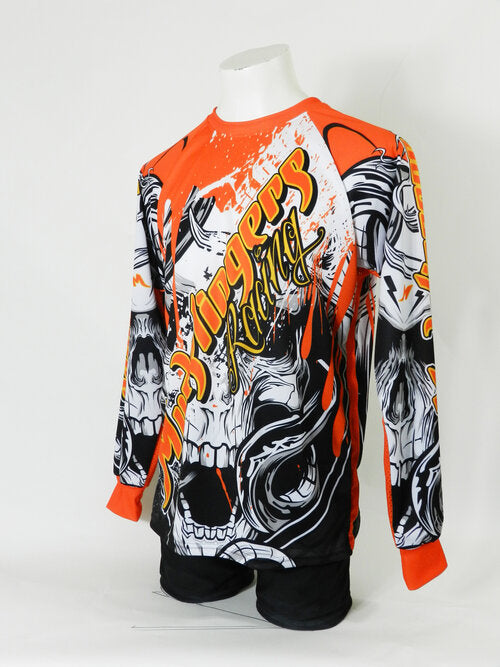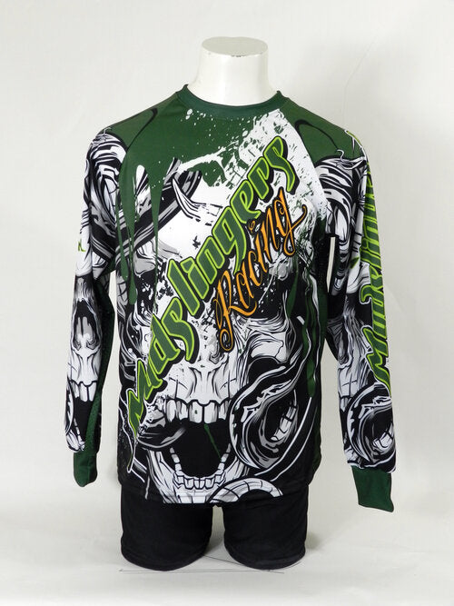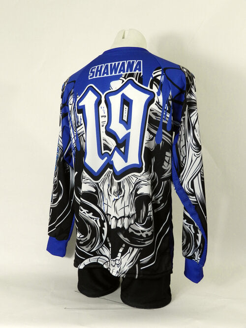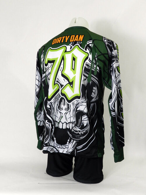 Full sublimation for motocross jerseys is a printing process that uses heat and pressure to transfer dye onto a fabric. This process allows for vibrant, long-lasting colours and designs that won't crack or fade over time. With full sublimation, the entire garment can be printed, including areas that would typically be left blank such as seams, collar, and cuffs. This creates a seamless, all-over design with a greater range of colours and shades; perfect for photographic or gradient designs. Full sublimation is the highest quality printing option for custom designed clothing, gear, team jerseys, sportswear and more.